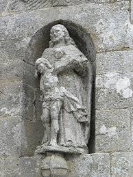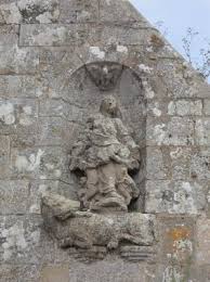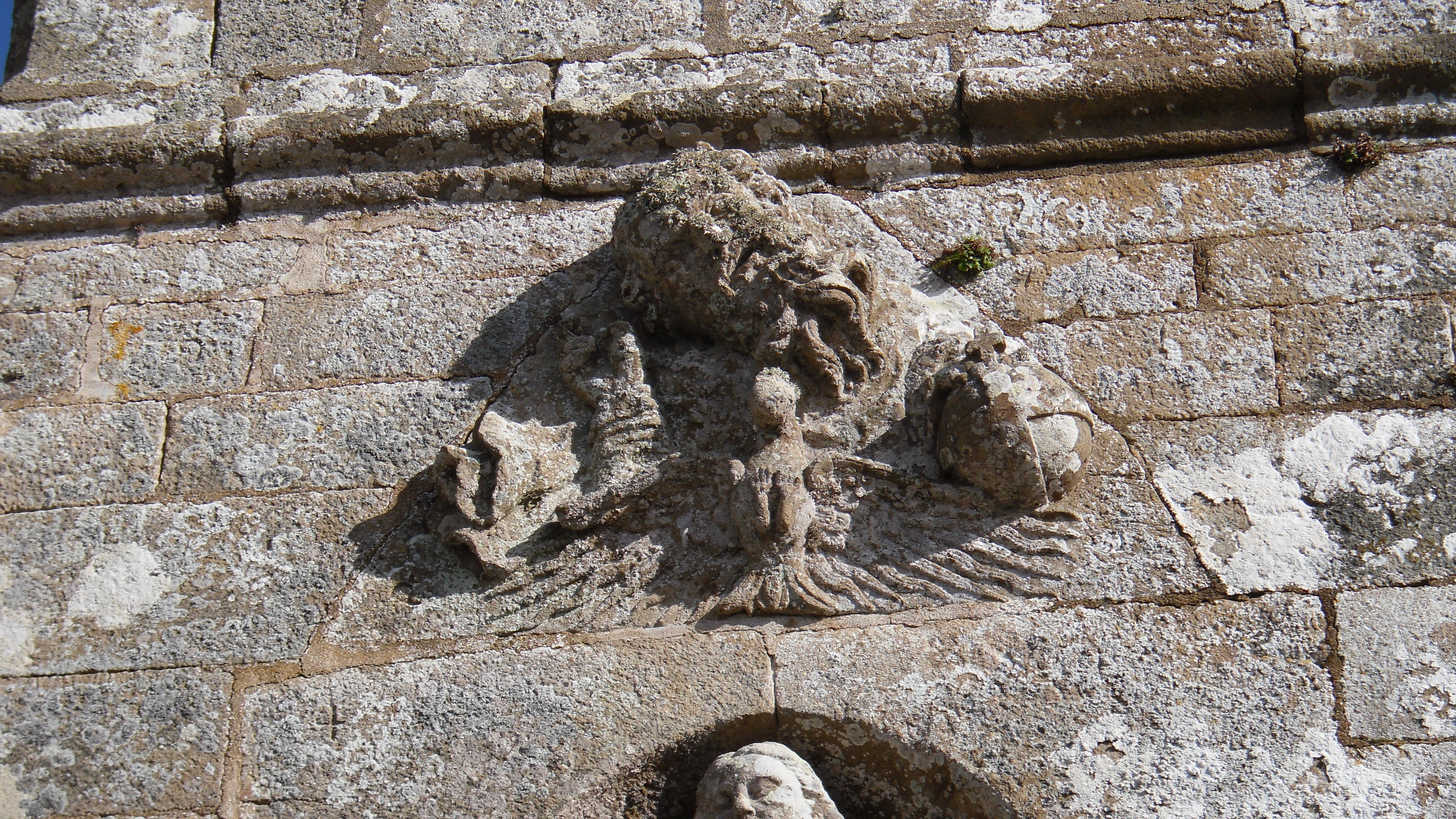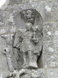 L'Archange Saint Michel, vêtu en légionnaire, tient dans sa main le ciboire et la chaîne qui lui servent à terrasser le démon, taillé en saillie, qui est couché sous ses pieds. La queue ophidienne de ce dernier monte sur la façade en faisant une boucle. A ses côtés, le buste d'un autre démon surgit du mur.