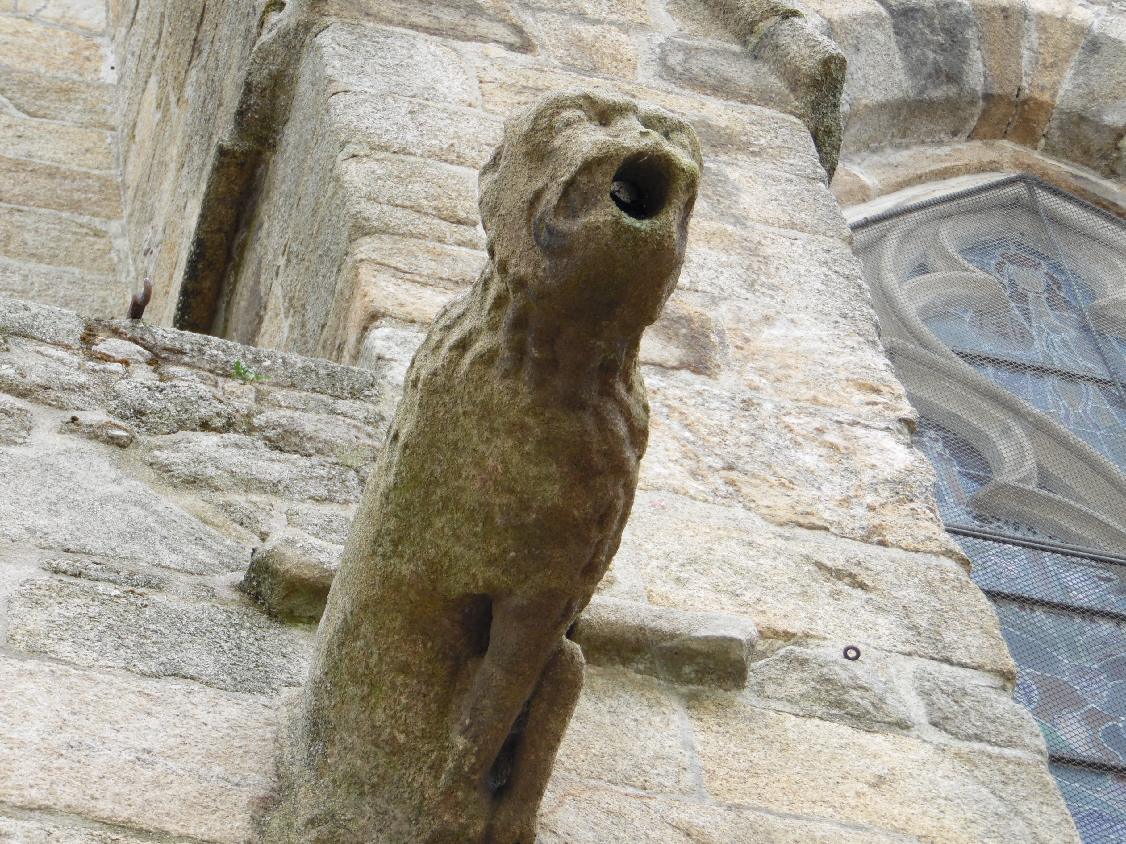 De nombreuses gargouilles assurent l'écoulement des eaux de pluie sur la façade nord. La plupart représentent des animaux chimériques selon l'usage de l'époque. Deux d'entre elles figurent cependant des silhouettes de de moines vomissant. On peut, peut-être, les mettre en rapport avec l'implantation des cordeliers à Guingamp en 1283 ou 1284.