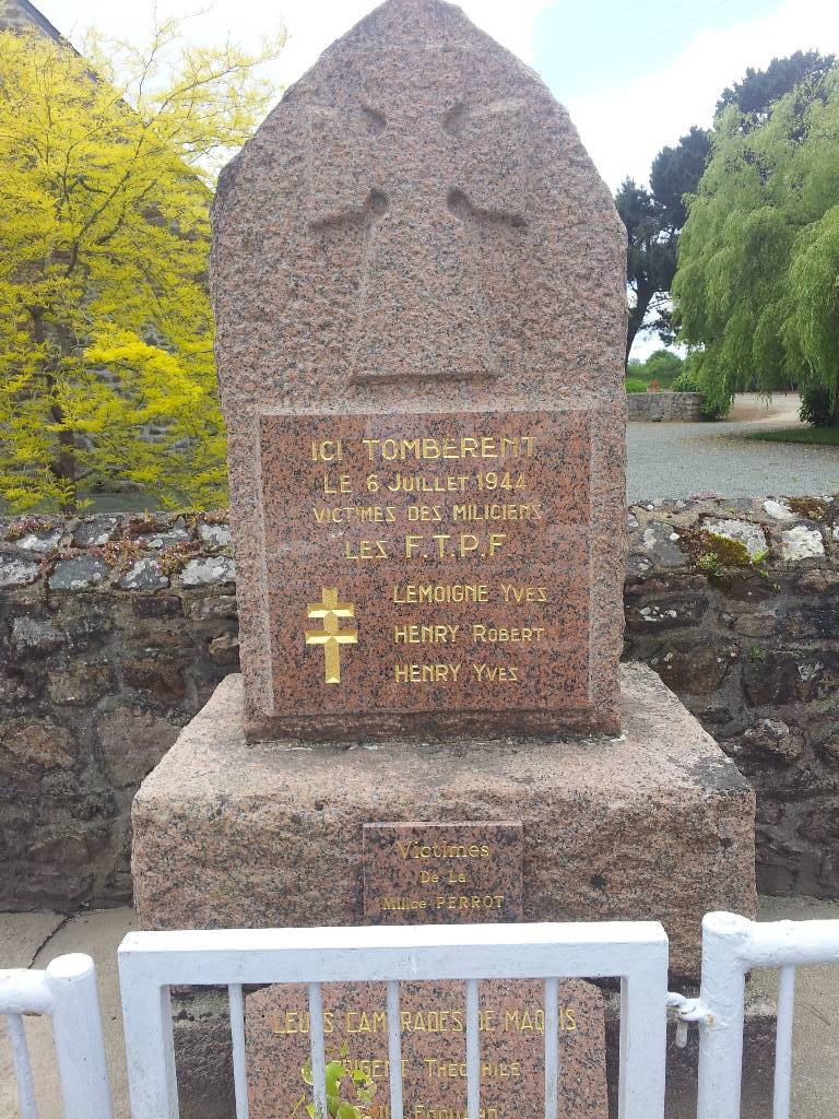 La stèle adossé au mur de la ferme Ty Nu rappelle le courage de trois jeunes résistants: Yves Lemoigne, Robert et Yves Henri qui se sont révoltés contre l'occupant nazi.