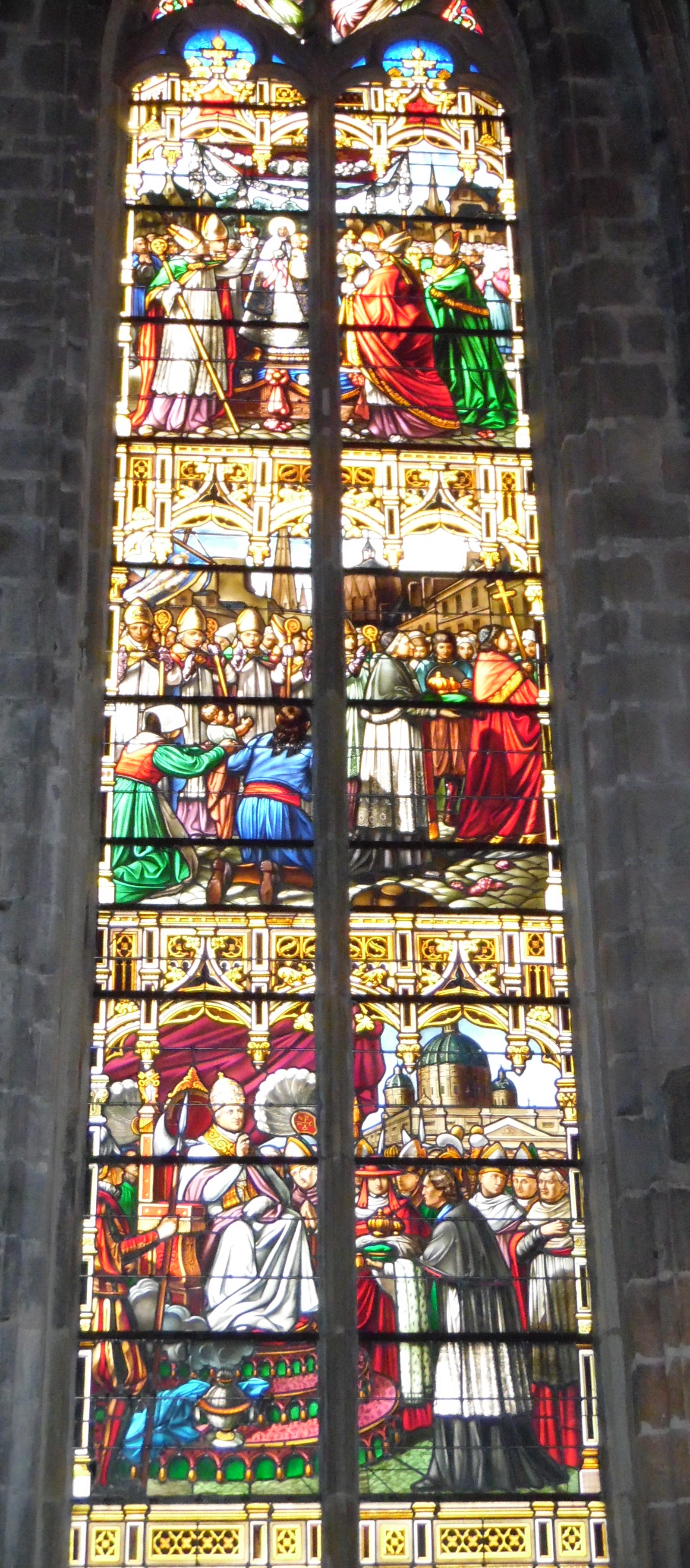 Tous les vitraux de la Basilique sont remplacés entre 1850 et 1885. Trois d'entre eux sont relatifs à des évènements qui se sont déroulés à Guingamp. Celui-ci rappelle le couronnement de la statue de Notre-Dame, le 8 septembre 1857. Cette distinction accordée par Rome est à l'époque assez rare. Le vitrail en rappelle les étapes sur trois niveaux: La partie supérieure montre les évêques de Bretagne disposant les couronnes offertes par Rome sur la tête de la Vierge et sur celle de l'enfant Jésus.