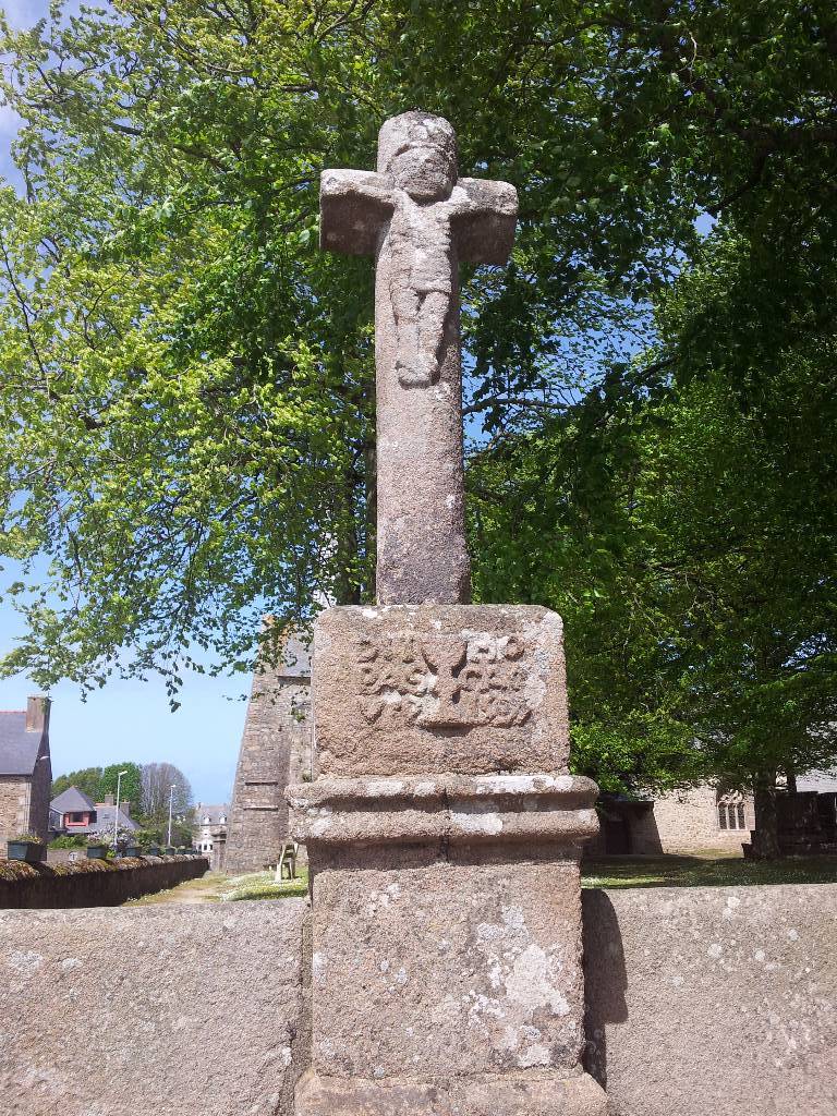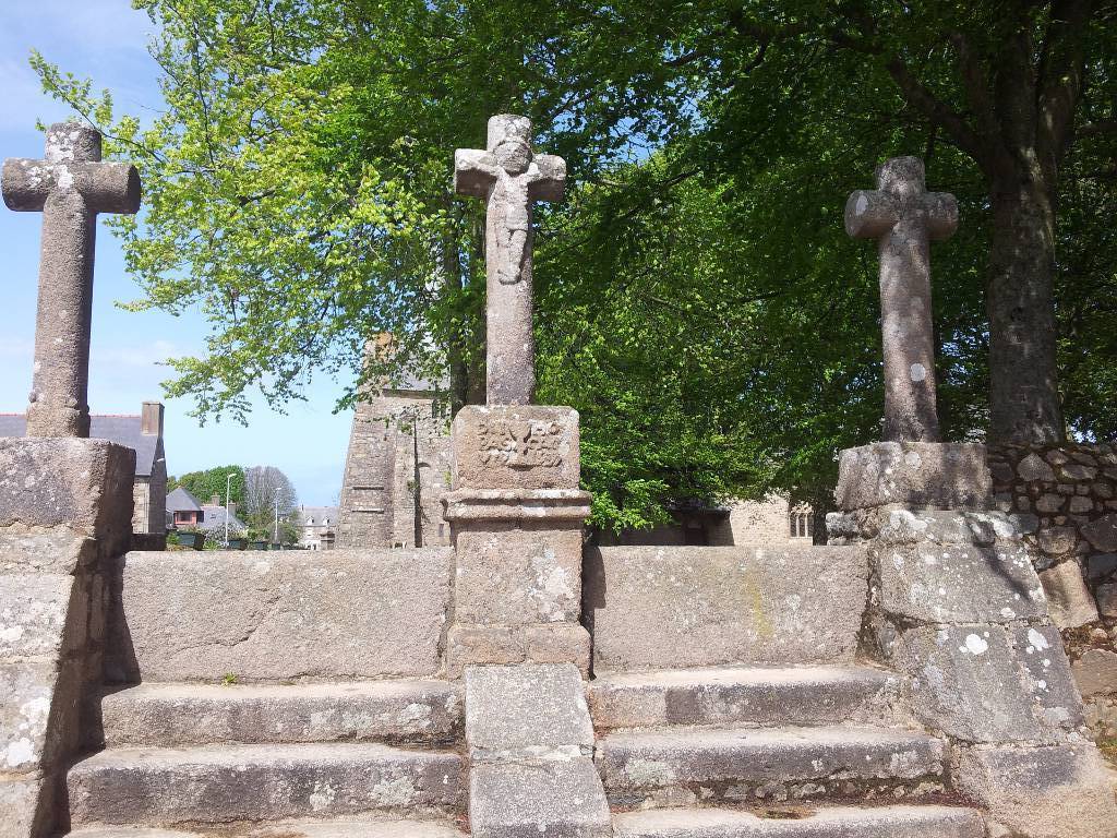 Cette ensemble est situé à l'entrée sud de l'enclos autrefois occupé par un cimetière, et auquel on accède par quelques marches barrées par les échaliers. Les trois croix représentent le Christ entouré du bon et du mauvais larron. La croix centrale est ornée d'un calice et d'une inscription citant la date de son édifice, ainsi que le nom d'un prêtre.